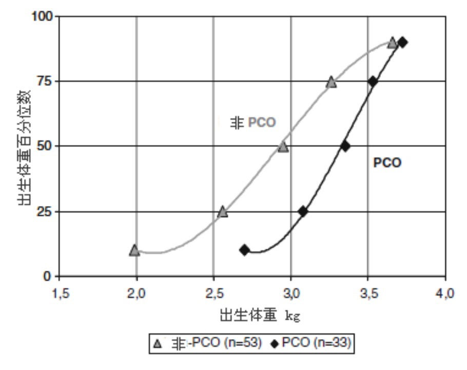 无多囊卵巢的(PCO)病人出生体重较PCO病人低(p<0.0005); POC病人的出生体重分布类似于一般人群。